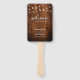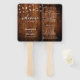 This rustic wedding program fan features a warm woodgrain background with softly glowing string lights, creating a cozy and elegant ambiance. The combination of handwritten script and sans-serif fonts adds a sophisticated touch, making it perfect for barn, outdoor, or country-style weddings. The front welcomes guests with the couple's names and wedding date, while the back provides a beautifully organized ceremony outline and wedding party details. Attached to a wooden handle for practicality, this fan doubles as a charming keepsake and a functional accessory for warm-weather celebrations, ensuring guests stay comfortable while following along with the special day's events.