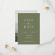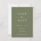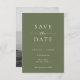 This wedding save the date card features a minimalist and modern style. The front has a clean Sage Green background with classic White typography, combining bold serif fonts with a touch of script for a refined look. The back showcases a black-and-white photo of the couple with text overlay, creating a romantic and timeless design.