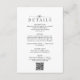 This wedding details card features a clean and elegant layout with a classic serif font and subtle script accents. The text is centre-aligned and divided into well-organized sections, making it easy to read. With a simple black-and-white colour scheme and plenty of white space, the design feels timeless, refined, and modern.