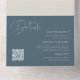 Invite guests to celebrate the mother to be with these modern and minimal all in one baby shower invitations in a beautiful colour palette of soft off white and dark dusty steel blue with deep muted teal undertones that's perfect for a dark moody aesthetic. Simple design features "baby shower" in casual handwritten script, with your event details beneath. Detachable bottom portion features three custom fields for additional details; shown with a diaper raffle, book request, and registry QR code. Simply seal and send!