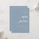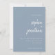 These elegant, minimalist wedding invitations feature white, modern script typography and clean, sans serif text for a simple and stylish dusty blue design you will love.