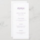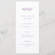 This elegant, minimal wedding menu card features modern script typography and clean, sans serif text for a simple and stylish white and lavender design you will love.