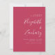 This simple yet bold modern wedding save the date card features white text in stylish handwriting calligraphy and sans serif font, aligned with the right margin on a magenta background. The back of the card is solid magenta.