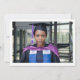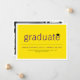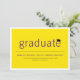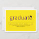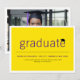 A modern minimalist graduation announcement photo card design featuring simple bold typography with a mortar board / graduation cap accent on a flat yellow colour background layer which can be personalized and changed to any custom colour of your choice. The back photo can be removed to add your own custom text.
