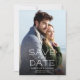 This save the date announcement card features a vertical photo that fills the front of the card. The text appears in white on top of the photo. The backside offers custom text for more wedding details.