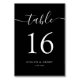 Featuring elegant white script on a bold black background, this table number card provides a modern minimalist aesthetic. Ideal for a chic wedding reception. Matching items available.