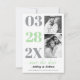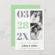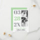 Modern mint green and grey with two photos Save the Date announcement. It showcases the date in mint green and ultimate grey typography in a column and two photos of the couple. The phrase "Save the Date" is in script style typography in mint. The back is of solid mint colour.