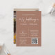 This invitation features an elegant modern minimalist style with beautiful calligraphy script wording "the wedding of" on a mocha mousse background. Please note: On the front, the wording of "the wedding of" and "reception to follow", the lines, and other graphic artwork elements cannot be deleted, edited, or changed. It's easy to customize this wedding invitation -- just personalize the text wording and replace the photo and QR code with yours.