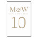Antique gold coloured text on ivory white. Personalise with Bride and groom's initials, wedding date, and table number.