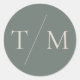 Simple monogram round sticker with minimal text and contemporary design, featuring a moss green background and text in warm cream sand. Use this sticker as envelope seal or to seal your wedding favour bags.