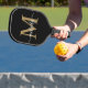Modern personalized custom colour pickleball paddle featuring a monogram and name shown in an editable fancy handwritten script name in customizable black, gold and white colours for the pickler or pickleball player. COLOR CHANGES: Change the text or background colours or add a styled graphics background by clicking on the EDIT tab in the PERSONALIZE section to create your own custom design. PADDLE OPTIONS: Choose from Black, Tan or White edging and grip colours on the ordering page. ASSISTANCE: For help with design modification or personalization, colour change, transferring the design to another product or if you would like coordinating items, contact the designer BEFORE ORDERING via the Zazzle Chat MESSAGE tab below or email makeitaboutyoustore@gmail.com.