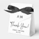 This Modern Monogram Wedding Thank You favour box with the bride and grooms initials, Thank You in a trendy script font and the happy couple's names and wedding date all in black tied with an elegant black satin bow would be perfect for favours at your wedding reception. It would be great for a candy station, on a thank you gift table, or at each place setting with a favour. Be sure you order enough for all your guests.