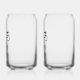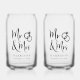 Custom can glass set for newlyweds featuring "Mr & Mrs" in a large elegant script and an illustration of two wedding rings joined together. Add the names of the bride and groom and the wedding date.