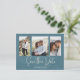 An elegant wedding save-the-date photo card with a three-photo multi-photo collage placement layout. This design features weddings save the date photo, budget multi-photo picture couple, modern simple elegant engagement, traditional budget engaged minimalist, calligraphy brush script blue, teal turquoise modern brush script, horizontal postcard 3 three photos, simple minimalist typography, chic stylish trendy invitations,