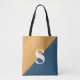 Modern geometric design tote bag with a mustard yellow and navy blue monogram design.