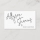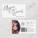 A modern and bold simple makeup artist and hair stylist business card featuring oversized name at the front in a handwritten style font and photo, qr code and social media at the back. All the colours are editable.