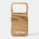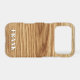 A modern white font with black drop shadow (both colors are customizable) over a photo of oak brown wood.