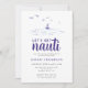 A simple, modern, elegant and chic nautical bachelorette party invitation template featuring an ink print of a water scene with ocean waves, a boat and seagulls. A fun, "let's get nauti" design for a modern bride. A lovely choice for a beach bachelorette weekend, a coastal bachelorette weekend, a lake, water edge bachelorette weekend or a boat or yacht bachelorette weekend.