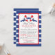 Modern red, white & blue bridal shower invitation. Our Ships Ahoy contemporary bridal shower invitation features a red & white stripe heart Buoy with a blue banner with the couples initials on it. The background is a bold & bright blue and white horizontal stripe. Flip the invitation over for a matching stripe back. Visit our shop to view this fun nautical bridal shower invitation with a bold red stripe background for a summer sea beach bridal shower.