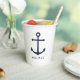 Modern Minimalist Nautical Paper Cups featuring navy blue anchor with personalized name in navy blue modern sans serif font style.
