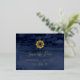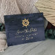 This modern nautical ship helm gold foil save the date foil invitation postcard is perfect for a cruise or beach wedding. The simple design features a gold foil boat wheel on a navy blue watercolor background with luxurious pressed gold foil typography.
