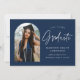 Trendy graduation announcement featuring the graduate's photo framed by a navy arch with "Graduate" in a white handwritten script. Personalize the front of the arch graduation announcement card by adding the graduate's name, graduation year, school name, and future plans. The photo graduation announcement reverses to display a navy and white dotted pattern. The announcement is suitable for both high school and college graduates.