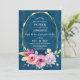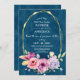 This is Navy Blue Burgundy Gold Blush Pink Wedding Invitations card. This card feature is a dark navy blue background decorated with a printed gold geometric frame that's trimmed with floral and greenery elements in shades of navy, pink, burgundy and more.