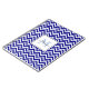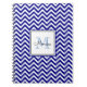 Personalized spiral notebook features navy blue chevron pattern with custom name in black handwriting font and monogram in sky blue shade in white square frame.