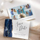 This elegant modern save the date card features a navy blue watercolor agate border trimmed with faux gold glitter. The customizable text combines handwriting script, copperplate and italic fonts in charcoal grey on a white background. Easily replace the five sample images on the back with your favourite photos, and add a brief text such as your website URL.