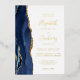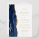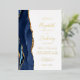 The left-hand edge of this elegant modern wedding invitation features a navy blue watercolor agate border trimmed with faux gold glitter. The customizable text combines handwriting, copperplate and italic fonts in real gold foil on a white background. The reverse side features a matching navy blue and gold agate design.