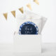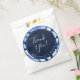 This beautiful, eye-catching design features a dark navy indigo blue circle with the words, "Thank You!" in white in trendy calligraphy script typography. Below the thank you are the customizable names of the newlyweds in curved sans serif text. The outer edge of the circle bears a blue and white shibori geode tie dye watercolor pattern resembling agate and marble. You can personalize this item by changing the monogram in the product template.