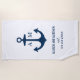 Modern nautical wedding beach towel favour design features a wedding monogram of the bride and groom displayed inside a boat anchor, and additional custom text for names and wedding date. Navy blue and white colour scheme.