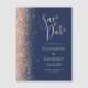 The left-hand edge of this elegant modern wedding save the date magnetic card features a peach faux glitter border. The customizable text combines peach handwriting, copperplate and italic fonts on a navy blue background.