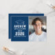 Announce your celebration with this modern navy graduation open house invitation featuring a classic cap icon and bold varsity style typography. Add the graduate’s name, school, and class year on the front with a favourite photo. The back features “Lets Celebrate the Graduate” with space for your party details and RSVP. Clean, timeless, and perfect for a senior open house.
