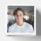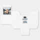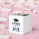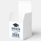 Modern graduation party favour boxes feature a senior photo, grad cap, and simple and black and navy blue typography design that can be personalized with the graduate's name and school. White background and text colours can be customized to match school or party theme colours.