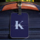 This simple, elegant navy blue luggage tag with your first name in a trendy script font in white typed over your first initial in a modern cap font in light blue on one side and a slide in card for your name, address and phone number on the other would look fabulous on your suitcases. It's stylish and trendy and yet very classic.
