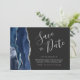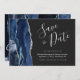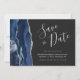 This elegant modern save the date card features a navy blue watercolor agate border trimmed with faux silver glitter. The customizable text combines handwriting script, copperplate and italic fonts in light silver grey on a dark charcoal grey background. The reverse side features a matching navy blue and silver agate design.