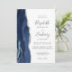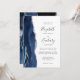 The left-hand edge of this elegant modern wedding invitation features a navy blue watercolor agate border trimmed with faux silver glitter. The customizable text combines handwriting, copperplate and italic fonts in charcoal grey on a white background. The reverse side features a matching navy blue and silver agate design.