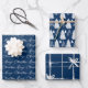 Simple, modern navy blue and white gift wrapping paper sheets, featuring the words "Merry Christmas" in an elegant handwritten script, a pattern with Christmas trees, and a pattern with bows and ribbons.