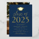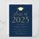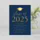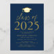 Invite guests to celebrate the grad with our modern class of 2025 graduation party invites. The invites feature a graduation cap at the top with "Class of 2025" displayed in gold foil lettering with a navy blue background. Personalize the invites by adding the graduate's name, school, and graduation party details. The gold foil graduation party invites reverse to display the graduate's photo.