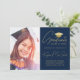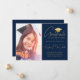 Send your family and friends a unique personalized photo college graduation card to wow them. This template design features your custom photo on the left and to the right a white grad cap sitting on the word "Graduate" written in a hand lettered faux gold script typography. Personalize your class/year, name, degree and other ceremony details on a classic navy blue background. Designed by Susan Coffey.