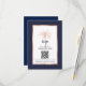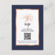 Provide your guests to reply to your wedding invitation and explore your wedding website with this elegant RSVP details and QR code design featuring modern script, navy blue and rose gold including an artistic palm tree and metallic rose gold copper frame on the front of the card. A navy blue background is on the front and back.