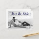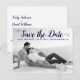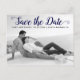 Modern navy blue script wedding Save the Date photo postcard. This contemporary typography Save the Date design features a black and white photo of the couple and the text "Save the Date" in blue in a modern script font.