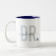 Cute, modern coffee mug saying DR. in modern typography in dusty blue tones with your family name in trendy script calligraphy on a two-toned coffee mug. Perfect appreciation gift for a special doctor in your life, a heartfelt thank you, or PhD graduation gift!