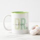Cute, modern coffee mug saying DR. in modern typography in dusty green tones with your family name in trendy script calligraphy on a two-toned coffee mug. Perfect appreciation gift for a special doctor in your life, a heartfelt thank you, or PhD graduation gift!