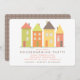 A fun design features a row of sweet little houses in cheerful shades of green, orange and brown in this contemporary take on a Housewarming Party theme.