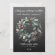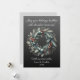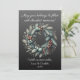 This card features a Nordic style wreath with a modern décor twist, in hues of grey and blue, with holly berries, and bulbs. This design is set against a gradient, dark grey backdrop, with white text, which may be changed by the customer.