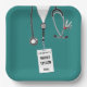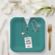 Creative nursing school graduation party plates design featuring hospital scrubs, stethoscope and Swiss Army knife. Edit text to add nurse's name.