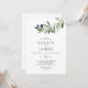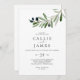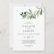 This modern olive branch casual wedding invitation is perfect for a boho wedding. The rustic yet elegant design features simple watercolor botanical green leaves and black olives on a small branch with a classic mediterranean feel.