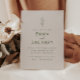 A simple and modern grey and olive green wedding invitation, with simple and script lettering, and a botanical element.